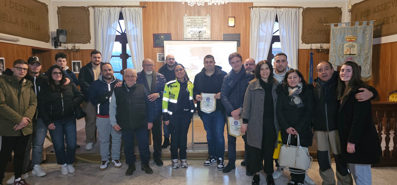 Al termine della lezione la Dott.ssa Sara Cicchella nel ringraziare l’Architetto Fiore e l’Assessore Comunale Iuliano, ha voluto omaggiare loro con il gagliardetto della Protezione Civile SIPEM SoS.