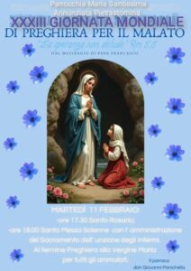 La comunità di Pietrastornina si ritroverà nel tempo di grazia del Signore, presso la Parrocchia Maria Santissima Annunziata, guidata dal Parroco Don Giovanni Panichella, a celebrare la Giornata del Malato e la Solennità della Beata Vergine Maria di Lourdes, con alle ore 17.30 il Santo Rosario e alle ore 18.00 la Santa Messa Solenne con l’amministrazione del Sacramento dell’unzione degli infermi, ed al termine si terrà la Preghiera alla Vergine Maria per tutti gli ammalati.