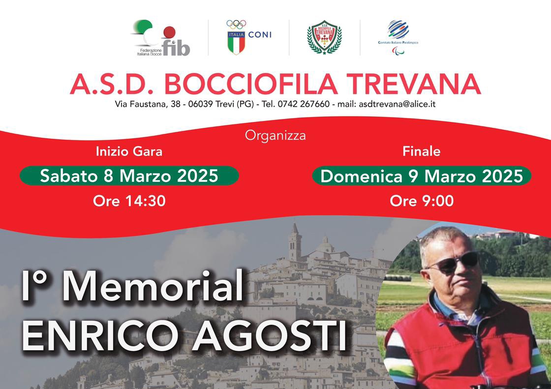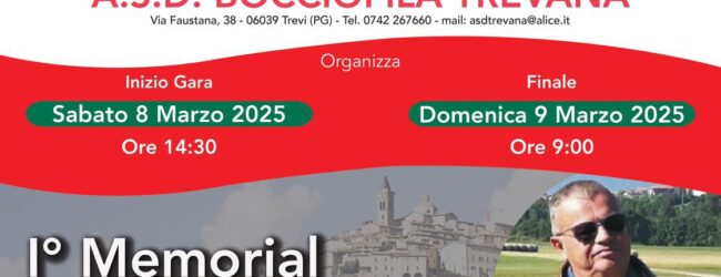Il torneo “Trofeo Trevi città dell’olio – 1° Memorial Enrico Agosti”, che si svolge nell’omonima cittadina, è valevole per la ranking nazionale. Le fasi eliminatorie si svolgeranno nella giornata di sabato dalle ore 14:30 alle 19,30, mentre le fasi finali, che chiuderanno il torneo, vedranno gli atleti sul campo di bocce dalle ore 9:00 di domenica 9 marzo.