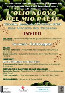 Domenica 30 marzo presso il Convento di San Francesco di Circello, è in programma la IX edizione del concorso OLIO NUOVO DEL MIO PAESE, organizzata dall’Associazione Culturale “CERCELLUS”. Con tale manifestazione si cerca di dare il giusto riconoscimento a quanti, per professione o per passione, si dedicano all’olivicoltura, fornendo un valido contributo alla conservazione degli spazi rurali. Infatti, uno degli obiettivi per cui è nata l’Associazione CERCELLUS è proprio la valorizzazione del territorio attraverso tutto ciò che ne esprime ricchezza, quindi: siti e monumenti, gastronomia e paesaggio.