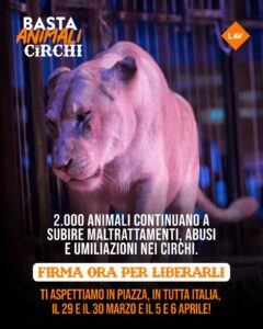La Lega Anti Vivisezione (LAV) di Benevento ha lanciato una campagna per chiedere al Governo di approvare il decreto attuativo che mette fine allo sfruttamento degli animali nei circhi e negli spettacoli viaggianti.