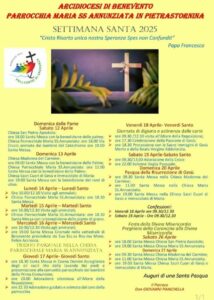 Dalla Domenica delle Palme ha inizio la Settimana Santa e la Parrocchia Maria Santissima Annunziata di Pietrastornina, guidata dal Parroco Don Giovanni Panichella, ha ufficializzato il Programma delle Celebrazioni, nell’anno del Giubileo della speranza “Cristo Risorto unica nostra Speranza, Spes non Confundit, dagli scritti di Papa Francesco”.