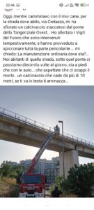 Calcinaccio cade dal ponte della Tangenziale Ovest: cittadino denuncia sui social la mancanza di manutenzione