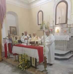 Al rientro in Chiesa Atto di Affidamento dei bambini al Sacro Cuore di Gesù. Il parroco Don Giovanni ringrazia le Autorità civili e militari, la banda musicale il comitato festa, il coro, i ministranti, le persone che hanno contribuito alla disponibilità del restauro della porta della Chiesa e tutto il popolo di Dio.