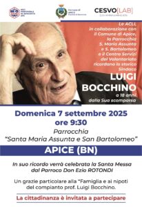 A diciotto anni dalla scomparsa del sindaco, prof.re Luigi Bocchino, la comunità di Apice si riunisce per ricordare un uomo che ha dedicato la sua vita al bene comune, con passione, visione e instancabile servizio. La Santa Messa sarà celebrata dal parroco Don Ezio Rotondi presso la Parrocchia di Apice, domenica 7 settembre alle ore 9.30.