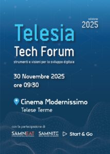 Due giornate per disegnare il futuro digitale del Sannio. Samnite, startup innovativa, annuncia un doppio appuntamento al Cinema Modernissimo di Telese Terme, con inizio alle ore 9.30, che metterà al centro giovani talenti, impatto sul territorio e visione d’impresa.