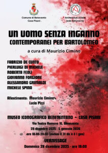 Domenica 28 dicembre, alle ore 18:00, verrà inaugurata la mostra “Un uomo senza inganno. Contemporanei per Bartolomeo”. La mostra, curata da Maurizio Cimino, si propone di coniugare Antico e Contemporaneo, unendo l’istanza della memoria e l’affondo nel presente. Consta di un prezioso nucleo di stampe d’epoca che si accompagna alle opere realizzate da autori d’oggi, appositamente per gli spazi di Casa Pisani, in un gioco voluto di sguardi e di corrispondenze, in un libero dialogo teso ad annullare la dimensione temporale e a stimolare la sensibilità dell’osservatore.