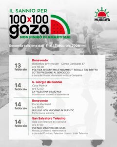 Nelle giornate di venerdì 13 e sabato 14 febbraio, Benevento aderisce alla campagna di raccolta fondi 100%Gaza con diverse iniziative in città e in provincia. Il 13 febbraio si terrà un’Assemblea pubblica presso la Biblioteca Provinciale, con un dibattito sul tema “Politiche securitarie e movimenti sociali: dal diritto sotto pressione al genocidio”.