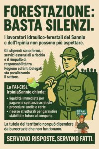 La FAI-CISL IrpiniaSannio intende richiamare l’attenzione delle massime istituzioni regionali e locali sulla drammatica paralisi che sta soffocando il settore della forestazione. Nonostante l’impegno profuso delle OO.SS. di categoria regionale, della Regione Campania e degli Enti Delegati, ma soprattutto dai lavoratori idraulico-forestali nella difesa del nostro fragile ecosistema, registriamo con profonda preoccupazione un clima di “assordante silenzio” e un’insostenibile precarietà economica che colpisce centinaia di famiglie.