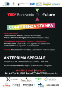 Nel corso della conferenza sarà inoltre presentata un’anteprima speciale: la proiezione del trailer ufficiale di TEDxBenevento, a cura del regista e direttore della fotografia Pasquale Rosati.