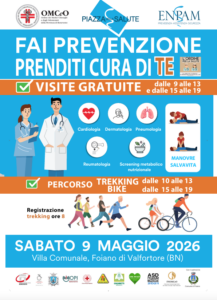 L’iniziativa, promossa dall’OMCeO di Benevento in collaborazione con il Comune di Foiano di Val Fortore e l’ENPAM, si terrà mercoledì 6 maggio 2026, dalle ore 9.00 alle 19.00, proprio a Foiano di Val Fortore.