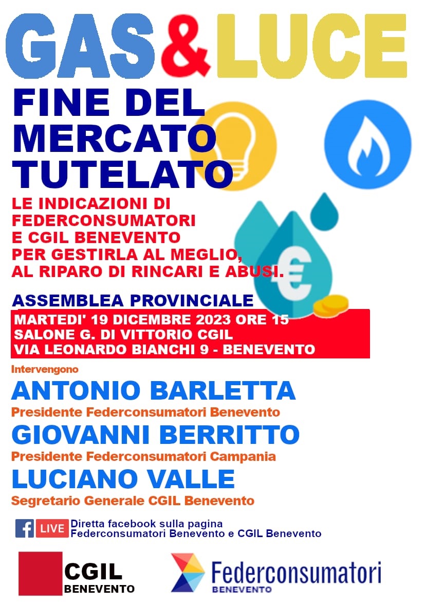 Martedì 19 dicembre 2023 alle 15:00, presso il Salone G. Di Vittorio della Camera del Lavoro di Benevento, CGIL Benevento e Federconsumatori Benevento organizzano un incontro in tema di mercato tutelato dell’energia. Ne da notizia Antonil Barletta, presidente di Federconsumatori di Benevento.