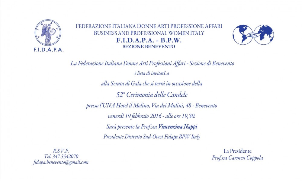 Anna LiguoriVenerdì 19 febbraio, la Fidapa-BPW Italy di Benevento festeggerà la 52esima edizione della “Festa delle Candele”. La serata di gala si terrà, alle ore 19.30, presso l’Una Hotel Il Molino di Benevento. A comunicarlo...