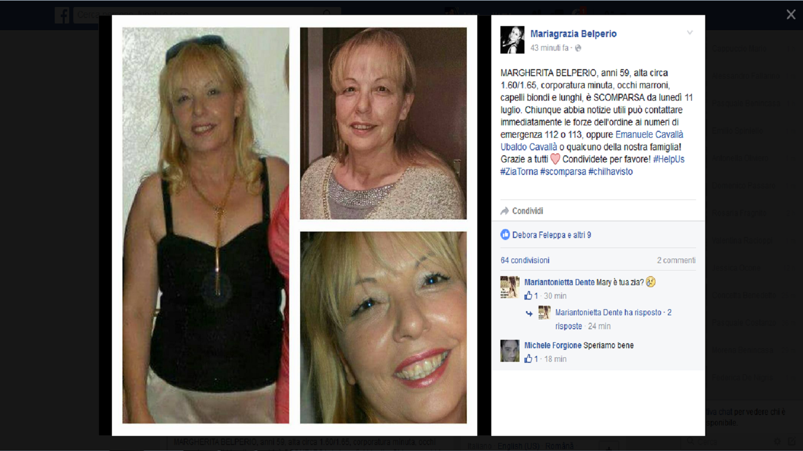 BUONALBERGO – Niente di fatto per quanto riguarda la scomparsa di Margherita Belperio, 59 anni, la donna di Buonalbergo allontanatasi da casa nella giornata di lunedì. La donna è salita sulla corriera per raggiungere Benevento per lavoro ma non è mai arrivata a destinazione. Enorme la preoccupazione della famiglia che anche nella giornata di oggi si affida a Facebook per tentare di avere notizie della propria congiunta. Ricordiamo i tratti somatici della signora Belperio: statura bassa 1.60 1.65 circa, corporatura piccola, capelli biondi (tinti). Chiunque abbia notizie utili può contattare immediatamente le forze dell’ordine ai numeri di emergenza 112 o 113.