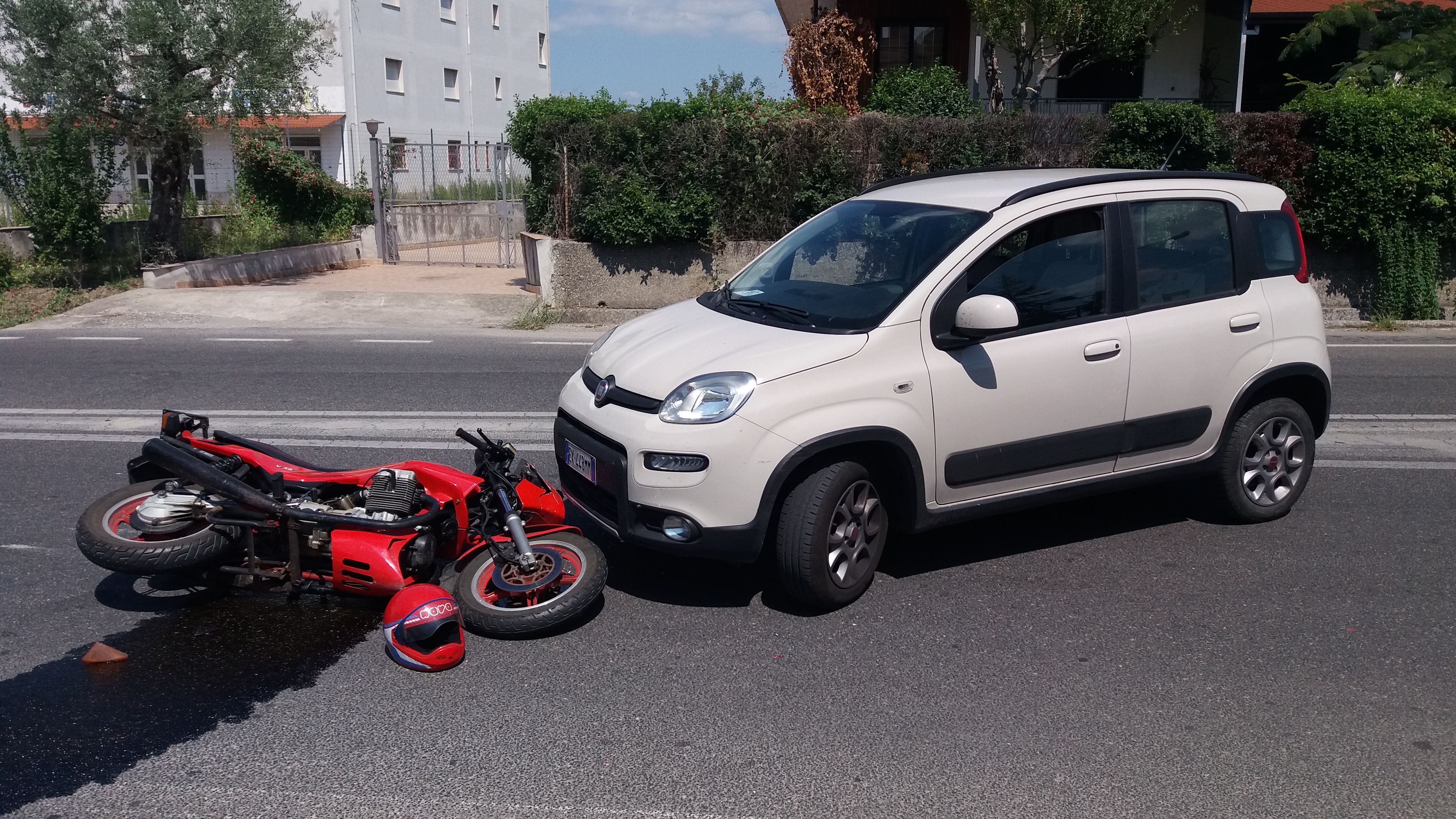 20160825_132702SAN GIORGIO DEL SANNIO –  Incidente non grave sulla Strada Statale Appia.  A scontrarsi frontalmente una fiat Panda e una moto d’epoca rossa Guzzi. Alla guida dell’auto un giovane di San Giorgio del Sannio il quale stava svoltando nella traversa del bar “La rosa dei Venti”, quando per cause in corso di accertamento, ha impattato contro la moto con alla guida un uomo di  50 anni anch’egli di San Giorgio e proveniente da Benevento. Sul posto un’ambulanza che ha trasportato il centauro all’ospedale Rummo per le varie ferite riportate a causa del sinistro. Presente sull’asfalto liquido infiammabile proveniente dalle due ruote maleodorante.