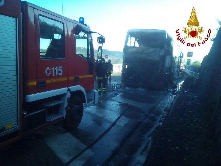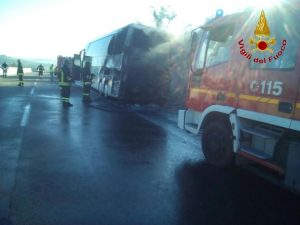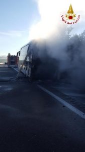 AVELLINO – Momenti di terrore questa mattina sull’autostrada A 16, Napoli-Canosa, al Km. 89,300, nel territorio del comune di San Sossio Baronia, in direzione Canosa, per un incendio che ha interessato un autobus con 45 persone a bordo, provenienti da Angri in provincia di Salerno, e dirette a San Giovanni Rotondo per un pellegrinaggio. Due le squadre intervenute dal distaccamento di Grottaminarda, supportate da un’autobotte proveniente dalla sede centrale del Comando di Avellino. Grazie al tempestivo intervento, gli occupanti l’automezzo di trasporto sono stati messi tutti in salvo. Il lavoro di spegnimento e di messa in sicurezza del veicolo avvolto dalle fiamme, è durato circa tre ore.