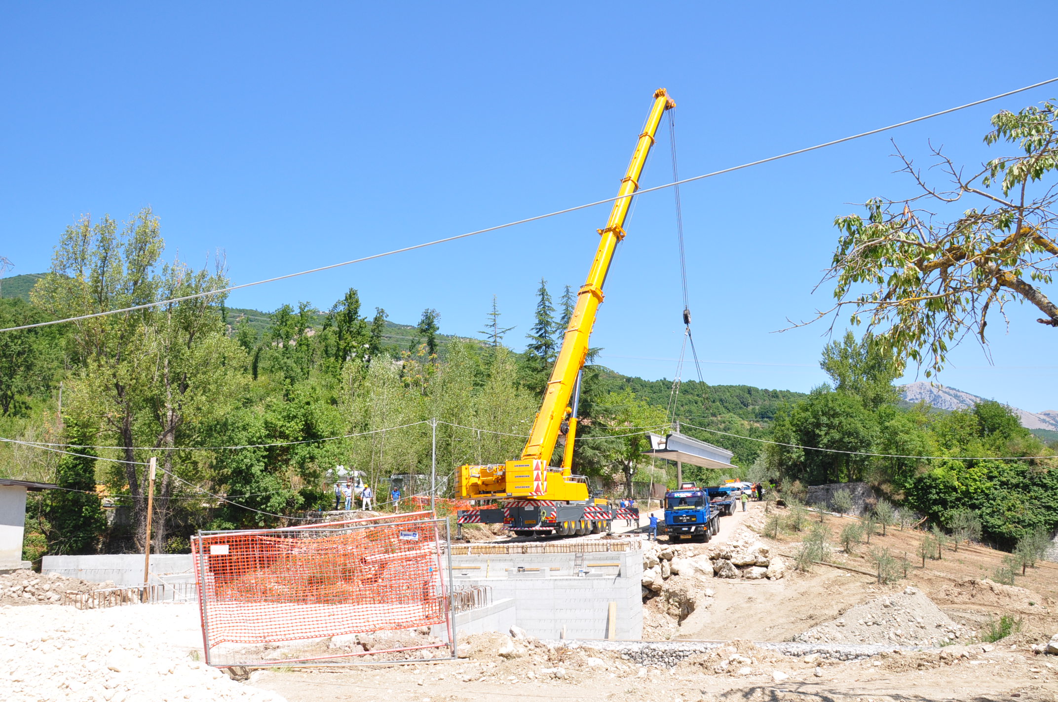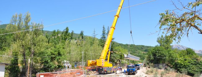 Proseguono i lavori di rifacimento del Ponte Jenga, in località Asciello, lungo la Strada Provinciale n.109 tra Cautano e Campoli Monte Taburno, dove questa mattina c’è stata la messa in opera di tre travi in cemento armato prefabbricato. Il Presidente della Provincia di Benevento, Claudio Ricci, si è recato sul posto per supervisionare l’andamento dei lavori insieme ai funzionari del Settore Tecnico della Provincia, gli ingegneri Salvatore Minicozzi e Filippo Iadanza e l’architetto Giancarlo Marcarelli, responsabili degli interventi sulla viabilità provinciale nell’area vitulanese.