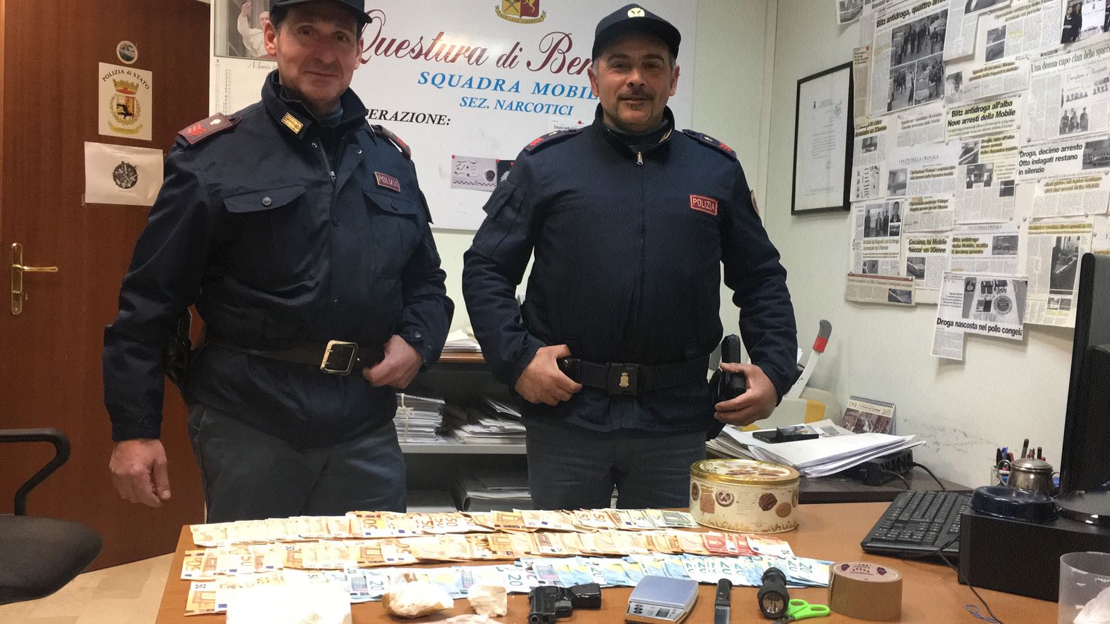 Subito dopo sono state eseguite le perquisizioni che hanno permesso di rinvenire una dose già confezionata che l’uomo aveva cercato di gettare, materiale per il confezionamento, un bilancino di precisione, oltre seimila euro in contanti in banconote di vario taglio ed una riproduzione di pistola priva di tappo rosso.