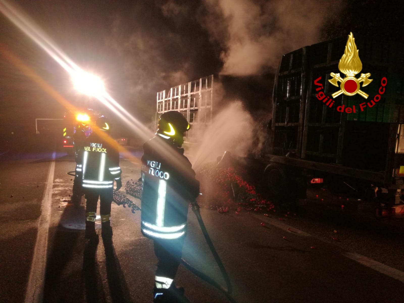 Alle ore 23’40 di ieri 7 settembre, la squadra dei Vigili del Fuoco di Lioni, è dovuta intervenire sulla SS 691, Fondo Valle Sele, al Km. 27,5, subito dopo lo svincolo di Teora, per un incendio che ha interessato un autoarticolato che trasportava pomodori. Il pesante automezzo è stato spento e messo in sicurezza.