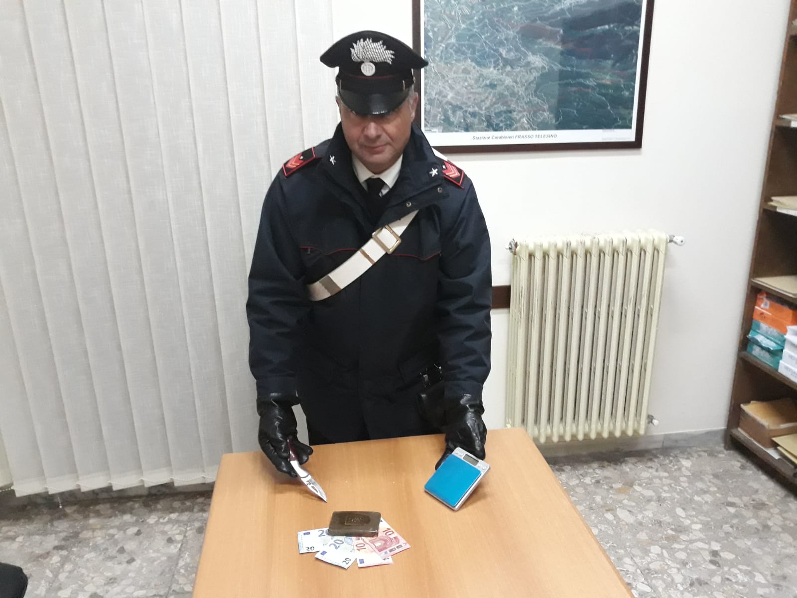 Nella serata del 18 febbraio 2019,i militari della stazione di Frasso Telesino hanno arrestato, in flagranza del reato di detenzione ai fini di spaccio di sostanza stupefacente, un 27enne del posto. Nell’ambito di servizi finalizzati al contrasto dell’uso e spaccio di sostanze stupefacenti, i militari procedevano alla perquisizione personale e domiciliare nei confronti del soggetto poiché fortemente indiziato di essere in possesso di droga. Nel corso della perquisizione domiciliare, occultati in un mobile, i militari rinvenivano un panetto di hashish del peso di 100 grammi, nonché un coltello utilizzato per il taglio, un bilancino di precisione e 60 euro in banconote da 10 e 20, che veniva sottoposto a sequestro in quanto ritenuto provento e pertinente all’attività di spaccio. L’arrestato, dopo le formalità di rito, è stato condotto agli arresti domiciliari presso la propria abitazione a disposizione dell’A.G. .