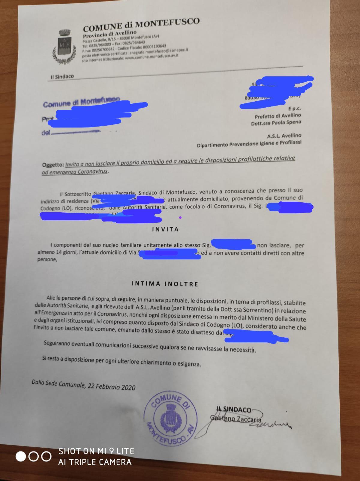 L’ escalation di contagi da Coronavirus in Italia non preoccupa solo il nord del nostro paese. Anche il sud sono scattate le misure di prevenzione, segno di un’attenzione massima delle autorità.Ed è proprio in quest’ottica che ad esempio, a Montefusco il sindaco ha chiesto a un nucleo in via precauzionale di autoisolarsi in quanto sarebbe tornato nel paese irpino un 27enne proveniente da Codogno (paese riconosciuto focolaio del Coronavirus) . A lui e a tutta la sua famiglia l invito a non lasciare casa per i prossimi 14 giorni. famiglia. Il tutto in attesa degli opportuni controlli