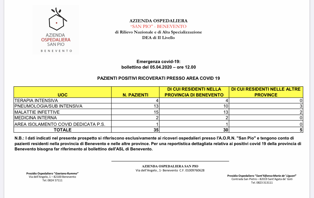 Aggiornamento da parte dell ospedale San Pio di Benevento sui ricoveri nel nosocomio beneventano. Il report odierno non vede sostanziali novità sul fronte nuovi ricoveri, ma una diversa distribuzione tra i vari reparti. Restano 30 sono i sanniti in cura al San Pio