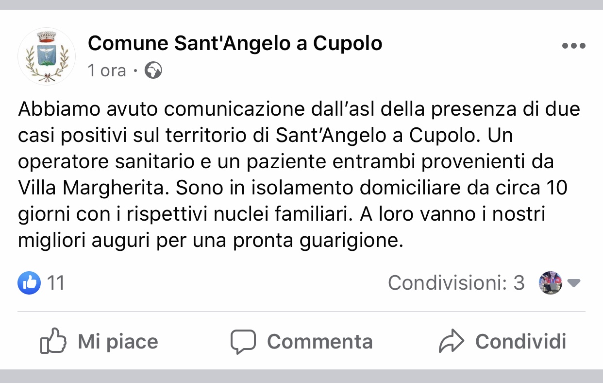 Si allarga la mappa dei comuni sanniti con casi positivi al Covid. A Sant’Angelo a Cupolo, finora immune, l ente comunale attraverso la propria pagina Facebook ha comunicato la notizia di due persone risultate positivi al virus. Si tratta di un paziente e un operatore sanitario di Villa Margherita . Le due persone sono in isolamento da circa 10 giorni così come si legge nel post
