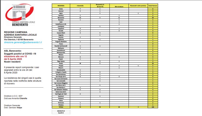 Centrotrentaquattro positivi nel Sannio. Aumentano ulteriormente i casi nella provincia. Dopo Benevento (28) è Paolisi il comune con un maggior numero di contagiati (20). Primo caso a Fragneto Monforte: si tratta di una donna del personale sanitario, in isolamento dallo scorso 27 marzo insieme al suo nucleo familiare .