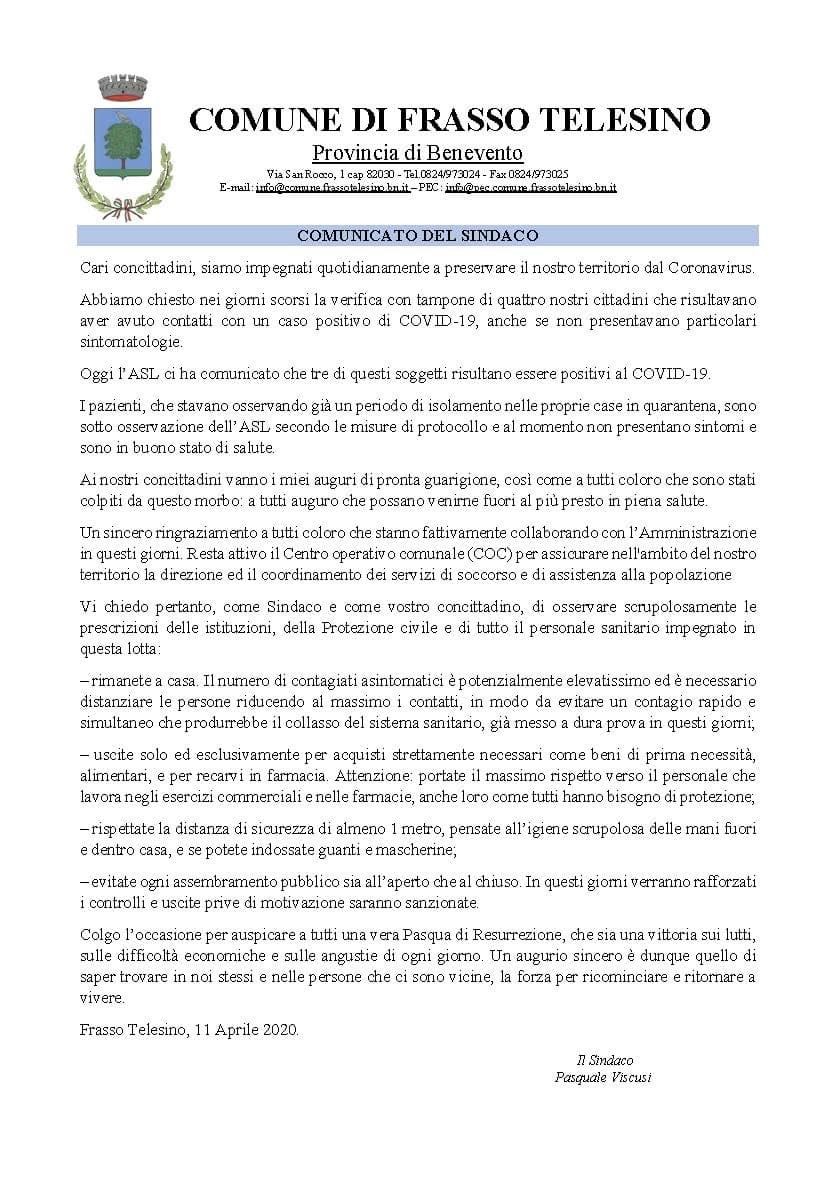 Tre casi positivi al Covid-19 nel comune di Frasso Telesino. A darne notizia un comunicato stampa del comune telesino: si tratta di tre persone che hanno avuto un contatto diretto con un precedente caso Covid, poi deceduto. Una quarta persona è risultata negativa. Le tre persone positive sono in assistenza domiciliare e non presentano sintomi. Nei giorni scorsi il sindaco Pasquale Viscusi aveva chiesto a gran voce l’intervento dell’Asl affinché venissero fatti i tamponi.