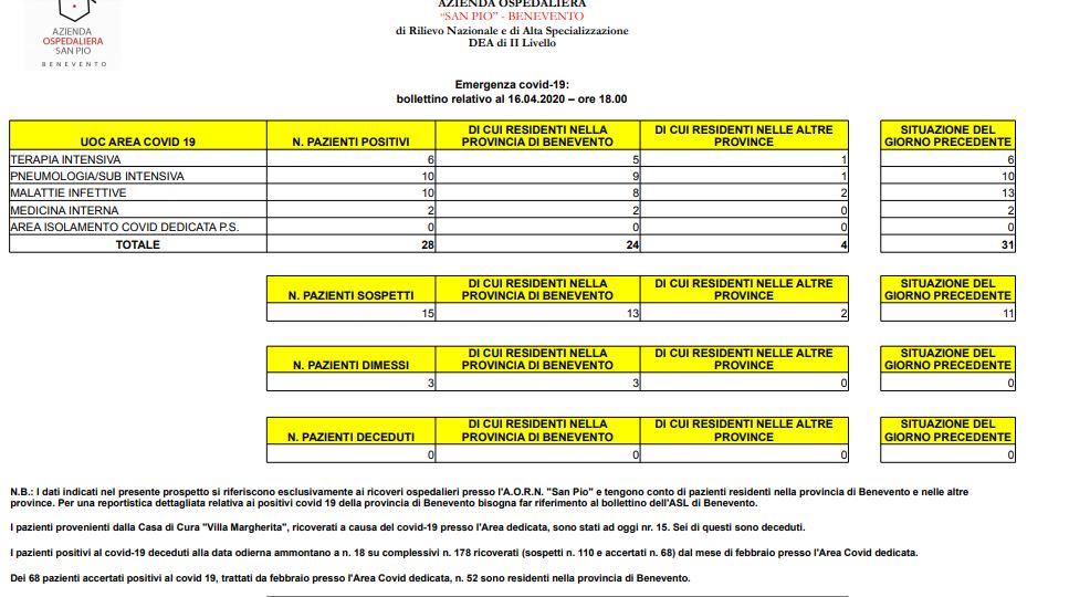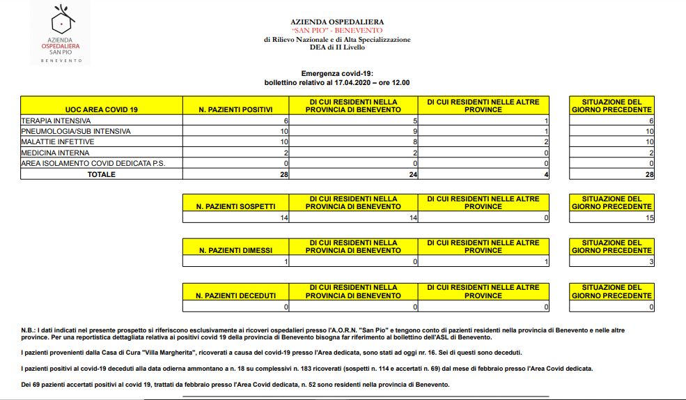 Resta pressochè invariato il numero dei pazienti positivi al Covid ricoverati al ”San Pio” di Benevento. In totale sono 28 persone, di cui 24 residente nella provincia di Benevento. Stessi numeri del bollettino delle 18 di ieri. A diminuire è, invece, il numero dei pazienti sospetti: da 15 a 14. E’ stato dimesso infatti un caso sospetto residente in un’altra provincia. Ma rispetto alla giornata di ieri aumenta il numero dei pazienti trasportati da Villa Margherita all’ospedale beneventano: ora in totale sono 16, di cui sei purtroppo sono già deceduti.