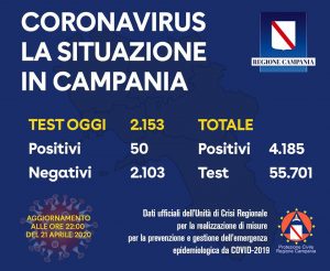 – Ospedale Sant’Anna di Caserta: sono stati esaminati 77 tamponi, di cui nessuno positivo;