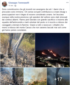 Preoccupazione è stata espressa questa mattina anche dal sindaco di Foglianise Tommaselli che sul profilo facebook, ha affidato il suo pensiero e dice: ‘gli incendi non avvengono da soli. I danni che si procurano sono immensi. Chi senza scrupoli contribuisce a creare disagi e preoccupazioni non è degno di essere considerato umano. Rassicuro i cittadini che vivono a ridosso del monte Caruso che non saranno lasciati mai soli come già hanno potuto constatare”.