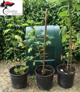 • in San Lorenzello (BN) un 50enne del luogo, già noto alle forze dell’ordine, a seguito di perquisizione personale e domiciliare è stato trovato in possesso di quattro grandi vasi nei quali insisteva una coltivazione di 60 piante di cannabis indica, di varie altezze comprese tra i 10 e 50 cm, rinvenuti su un terrazzo dell’abitazione e vari prodotti e componenti per la produzione (innaffiatoio, termometro, fertilizzante ed altro), nonché 300 semi della stessa sostanza e gr. 3,5 di marijuana occultati nella camera da letto;