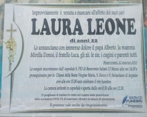 Le cause del decesso della giovane sono, secondo l’autopsia, da attribuire ad una insufficienza respiratoria acuta cagionata dai traumi subiti nel tragico incidente. La salma di Laura partirà alle ore 14 dalla camera ardente dell’ospedale San Pio di Benevento e il tutto si svolgerà nel pieno rispetto delle norme anti covid. Il sindaco ha dichiarato lutto cittadino per la giornata di sabato.