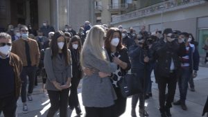 Il Covid non ferma i tanti amici che, oltre alla famiglia, hanno voluto dare l’ultimo saluto ad Aldo Gioia nel giorno dei suoi funerali. Gremita, nei limiti della capienza per le norme anticovid, la chiesa di San Ciro, così come il piazzale antistante. Una commozione composta ha pervaso i presenti, a cominciare dalla moglie Eliana Ferrajolo (nella foto in basso) e la figlia Emilia. Toccanti le parole del parroco, Don Luciano Gubitosa, che ha celebrato la messa e tratteggiato la “madre e sposa” come una donna capace di un grande atto di perdono verso la figlia.