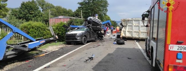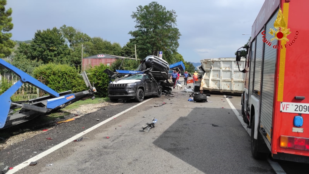 La squadra dei Vigili del Fuoco del distaccamento di Bisaccia è intervenuta sulla SS 7, Ofantina, in località Scalo di Calitri, per un incidente stradale che ha visto coinvolta una bisarca che trasportava sette autovetture nuove, ed un autotreno con due cassoni adibiti al trasporto di materiale ferroso da riciclare. Nel violento impatto sono rimaste danneggiate anche due autovetture in sosta e feriti i conducenti dei due pesanti automezzi. Si tratta di un 38enne originario di Cariati in provincia di Cosenza 50enne di Giffoni Valle Piana nel salernitano. I due sono stati trasportati dai sanitari del 118 intervenuti rispettivamente presso gli ospedali di Sant’Angelo Dei Lombardi e di Melfi. La squadra dei Vigili del Fuoco intervenuta ha provveduto alla messa in sicurezza dei veicoli incidentati.