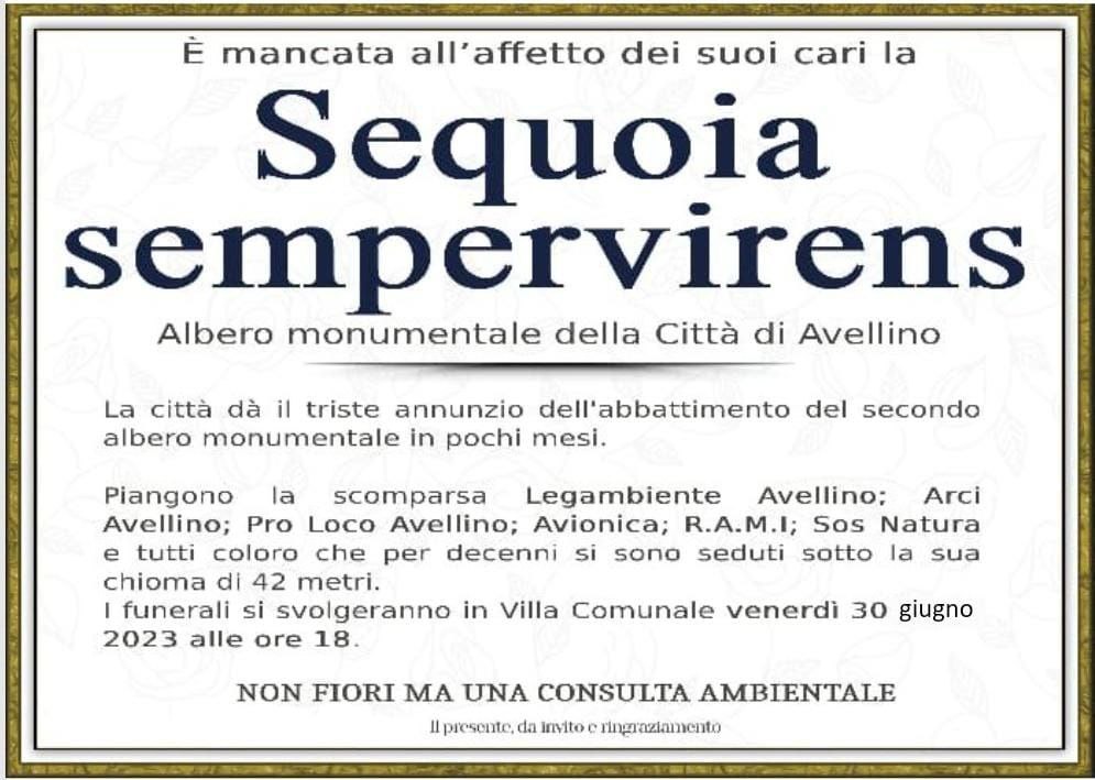 “Per questo abbiamo scelto di celebrare il funerale della Sequoia Monumentale venerdì 30 giugno 2023 alle 18 presso la villa comunale di Avellino. La manifestazione è aperta a tutta la cittadinanza – concludono – e vedrà la partecipazione, oltre che di Legambiente Avellino, anche di altre realtà associative del territorio come Arci Avellino, Pro Loco Avellino, Avionica, R.A.M.I, Sos Natura”.