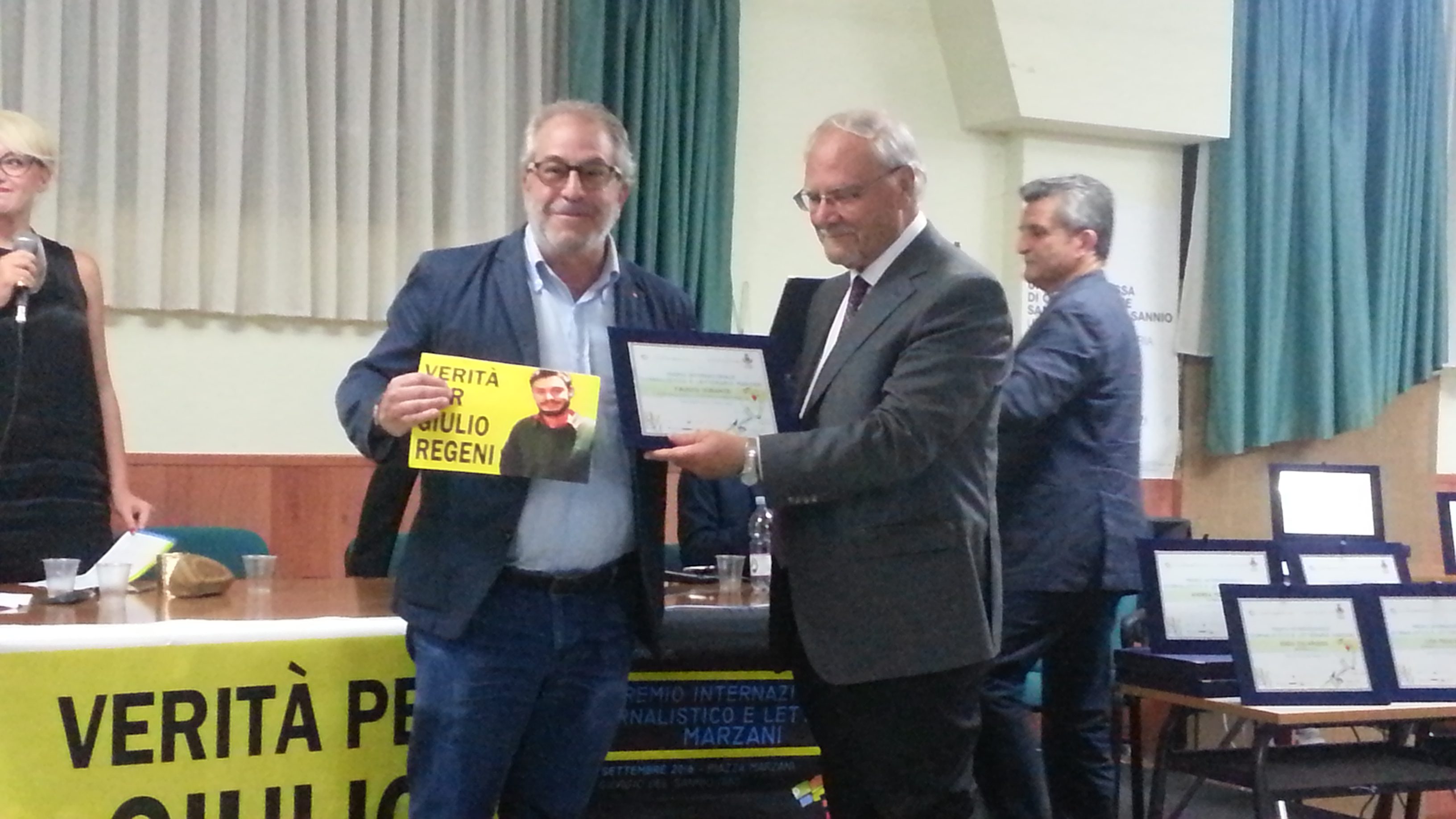 Dialogo e cooperazione nel nome di Giulio Regeni, cui il patron Enzo Parziale ha voluto dedicare l’edizione di quest’anno. Verità per Giulio Regeni ha campeggiato per l’intera durata del Premio nella speranza che si possa finalmente fare luce sulla morte dell’attivista e si assicurino alla giustizia i responsabili. A margine del convegno la premiazione degli eletti. Da Antonello Perillo, caporedattore del TG 3 Campania a Bruno Menna, da Antonietta Gnerre a Donato Zoppo, da Mario Parente, a Fausto Durante passando per Lisa Pedicino e Andrea Porrazzo, Francesca Bellino Mahdi El Nemr. “In contumacia” i premi a Houcine Abassi, tunisino, Premio Nobel per la pace 2015 e per Kiwanc Eli Acik, giornalista turco cui il regime di Erdogan ha impedito di lasciare il Paese per poter ritirare il Marzani 2016.