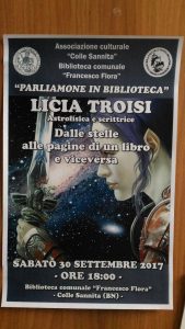 Continuano le iniziative curate dall’Associazione culturale “Colle Sannita” presso la Biblioteca Comunale “Francesco Flora”.Libri, incontri culturali e letture. Nell’ambito della rassegna “Parliamone in Biblioteca” c’è Licia Troisi, astrofisica e scrittrice di successo che torna nel comune sannita per parlare di scienza e fantasia, di come attraverso la sua professione meravigliosa, sia ispirata per la scrittura dei suoi romanzi.” Licia Troisi è tra le prime scrittrici italiane del genere Fantasy, autrice di grande spessore, porta nella nostra Biblioteca momenti di grande interesse scientifico e fantascientifico. L’ incontro intitolato “Dalle stelle alle pagine di un libro e viceversa” è un percorso interessante per scoprire la nascita di una storia, che ha basi fondate nella realtà oggettiva della scienza, ma che poi prende il sopravvento e la leggerezza di storie immaginate che probabilmente sognamo tutti. Per la Biblioteca è una grande ritorno, e ci auguriamo che tutti, grandi e bambini sappiano cogliere il valore della lettura con spirito di curiosità”: Ha affermato Angelo D’Emilia Presidente dell’Associazione Culturale “Colle Sannita”.L’evento culturale è previsto per sabato 30 settembre alle ore 18.00.