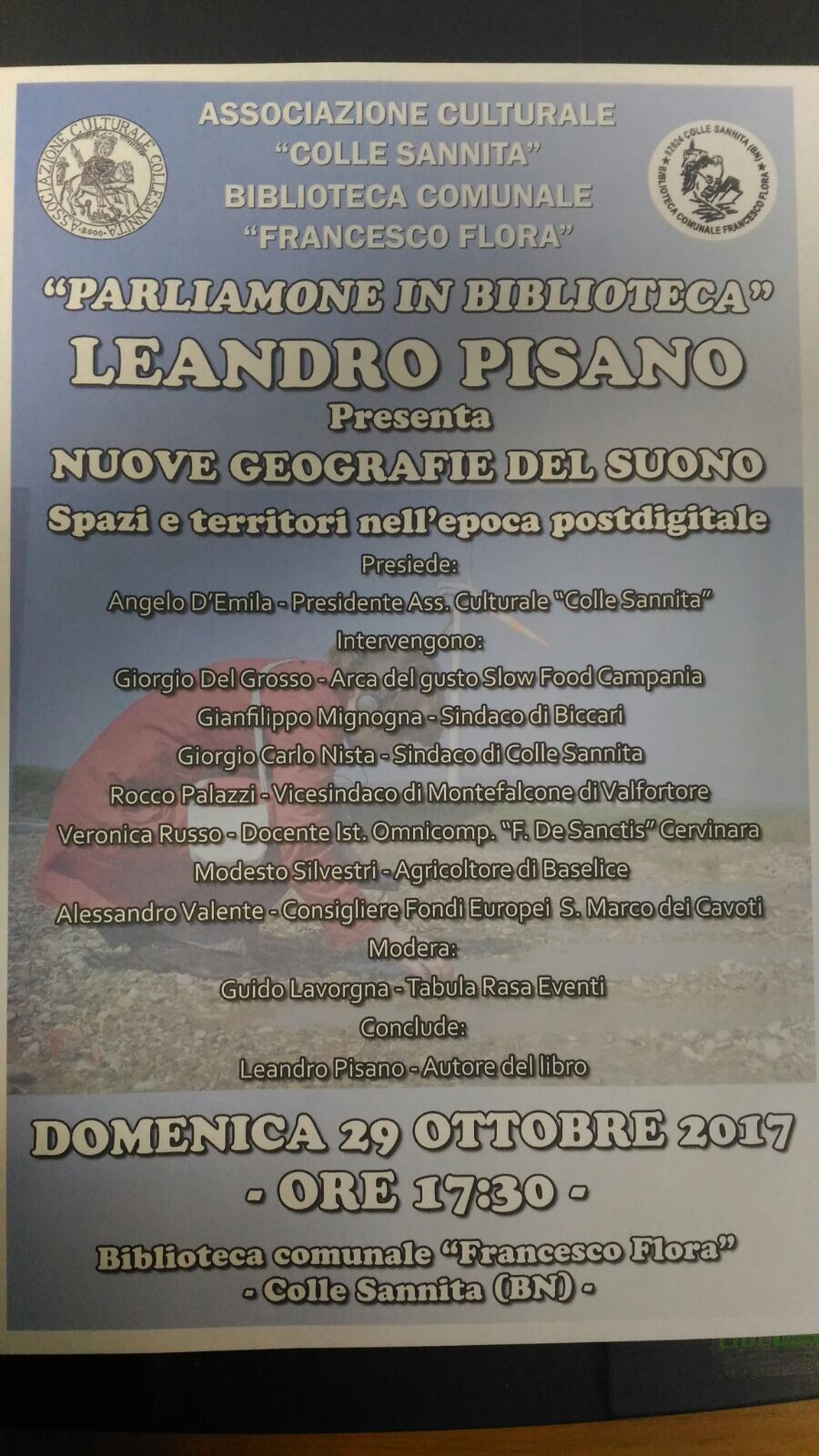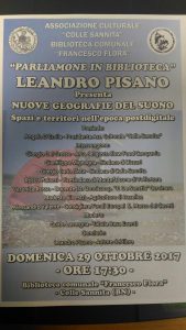 Continuano gli interessanti incontri culturali della Biblioteca comunale di Colle Sannita. “Parliamone in Biblioteca” è l’appuntamento che mette lettori e autori a confronto, dove è possibile incontrare scrittori di successo o emergenti e parlare di libri, di esperienze culturali e di tutto il mondo che c’è dietro una pagina.Domenica 29 ottobre alle ore 17.30, è la volta dello scrittore Leandro Pisano, che presenterà “Nuove geografie del suono, spazi e territori nell’epoca postdigitale”.Leandro Pisano è dottore di ricerca in Studi culturali e postcoloniali del mondo anglofono presso l’Università “L’Orientale” di Napoli e cultore della materia in Didattica del latino presso l’Università “Federico II” di Napoli. Docente di ruolo in materie letterarie, latino e greco, si occupa di arti sonore, ruralità e tecnoculture. Dal 2003 cura il festival internazionale New Arts, Interferenze ed ha fondato nel 2014 Liminaria, progetto di potenziamento delle reti locali nel Fortore beneventano. All’incontro con l’autore prenderanno parte, il Presidente dell’Associazione Culturale “Colle Sannita” Angelo D’Emilia, Giorgio Del Grosso, Arca Del Gusto Slow food Campania, Gianfilippo Mignogna, Sindaco Biccari,Giorgio Nista, sindaco di Colle Sannita,Rocco Palazzi, vice sindaco di Montefalcone di Valfortore, Veronica Russo,Docente istituto Omnicomprensivo “F.De Sanctis” Cervinara, Modesto Valente, Consigliere Fondi Europei San Marco dei Cavoti,modera Guido Lavorgna.