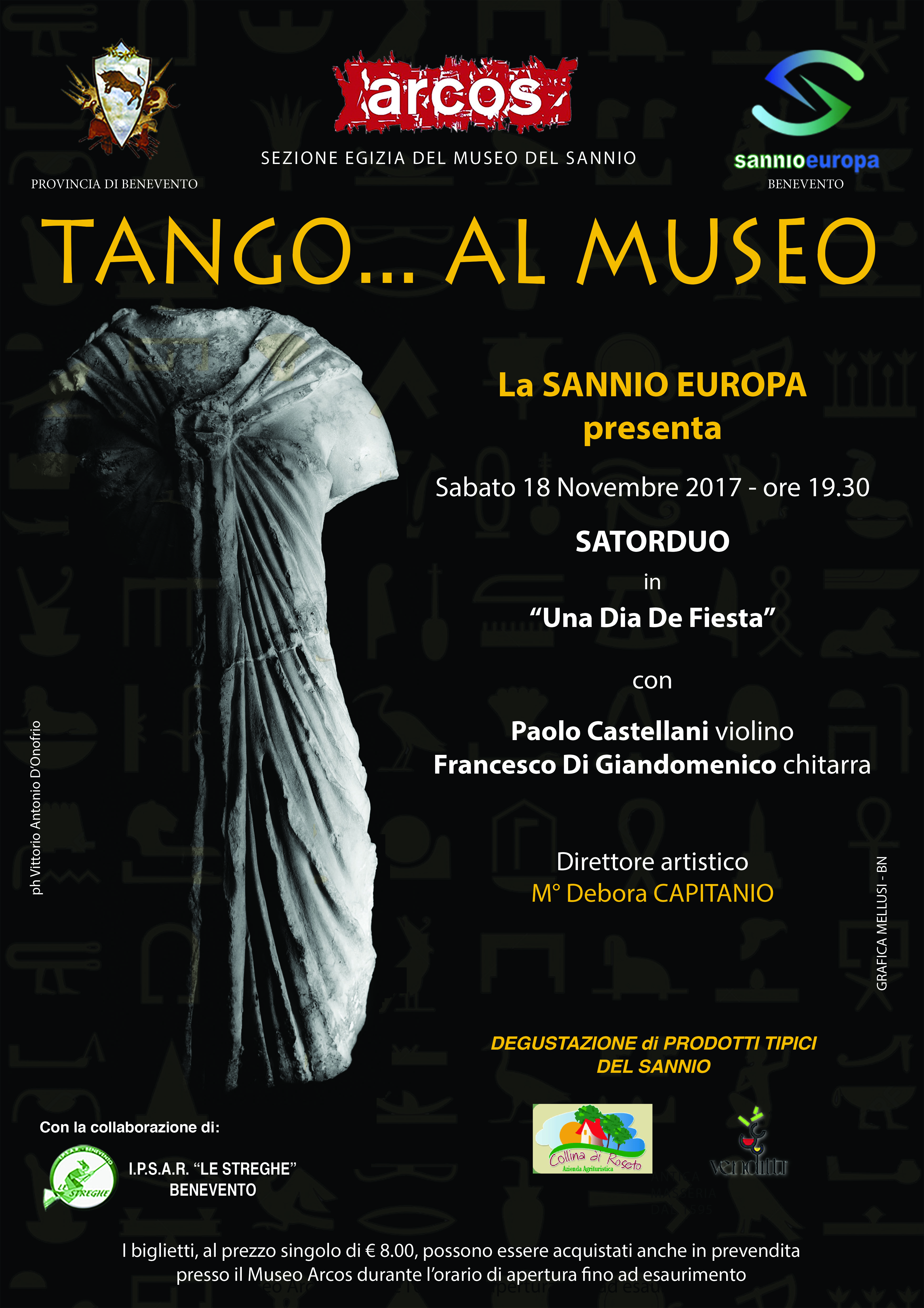 Sabato 18 novembre alle ore 19,30, presso il museo Arcos di Benevento è di scena il tango con l’evento “Satorduo. Una Dia de Fiesta” con Paolo Castellani e Francesco di Giandomenico.”Tango al … museo” è il titolo del nuovo evento musicale che ha la direzione artistica del M° Debora Capitanio, ideato da Sannio Europa.”Invito ad ascoltare musica ispirata ai tanghi argentini, sulla scia delle precedenti positive esperienze musicali che, da tempo ormai, questo Museo dedicato alla mostra permanente dei reperti del Tempio della dea egiziana Iside e a mostre estemporanee, offre ai visitatori” Ha affermato il Presidente della Provincia Claudio Ricci.