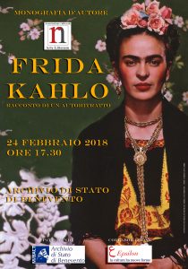 Sabato 24 febbraio 2018 alle ore 17.30 Arte Litteram, dopo il successo della prima edizione, ripropone all’Archivio di Stato di Benevento l’ appuntamento gratuito interamente dedicato ad una delle artiste più affascinanti del XX secolo: “FRIDA KAHLO – Racconto di un autoritratto”.