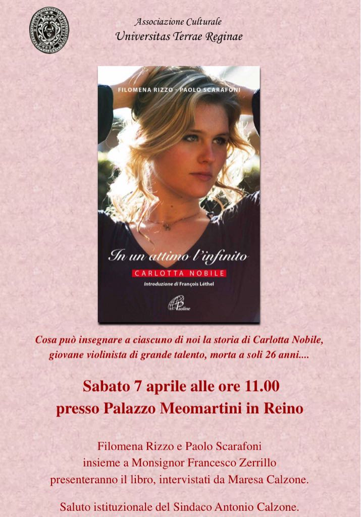 Sabato 7 aprile alle ore 11.00 presso Palazzo Meomartini, sede del Comune di Reino, è in programma la presentazione del libro su Carlotta Nobile “In un attimo l’infinito” scritto a quattro mani da Filomena Rizzo e Paolo Scarafoni.