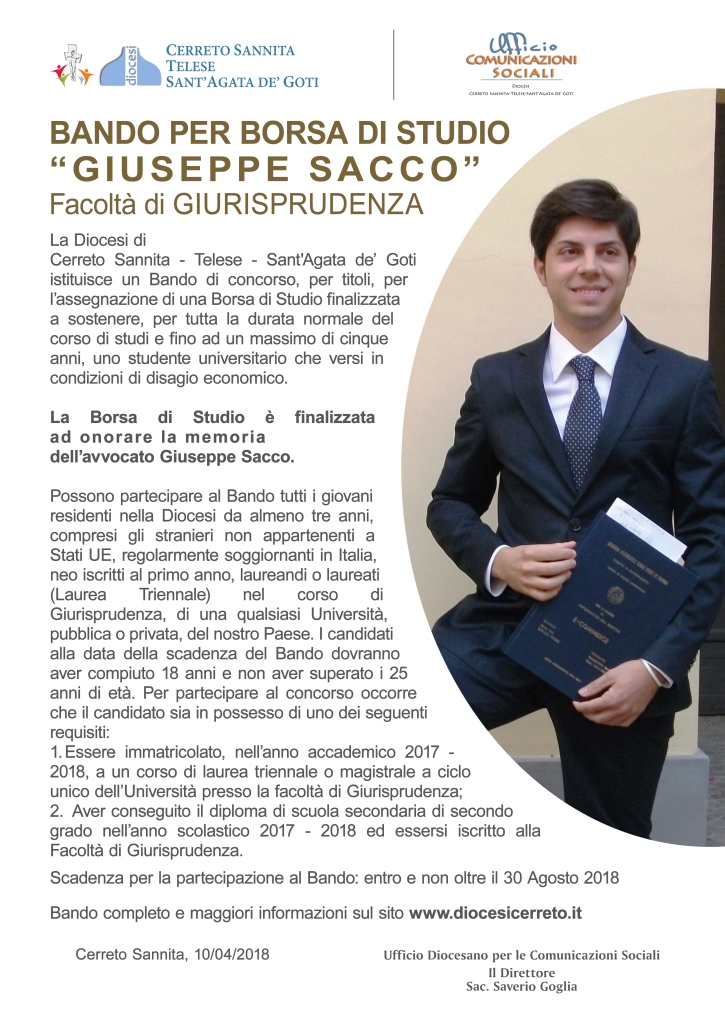 La Diocesi di Cerreto Sannita-Telese-Sant’Agata de’ Goti ha istituito un bando di concorso, per titoli, per l’assegnazione di una borsa di studio finalizzata a sostenere, per tutta la durata normale del corso di studi e fino ad un massimo di 5 (cinque) anni, uno studente universitario che versi in condizioni di disagio economico. La borsa di studio è interamente finanziata dalla famiglia Sacco, al fine di onorare la memoria del figlio Giuseppe, al quale la borsa stessa è intitolata.