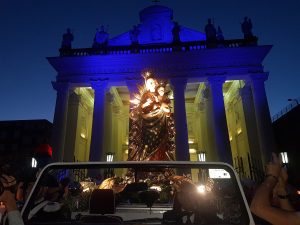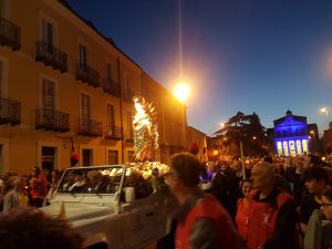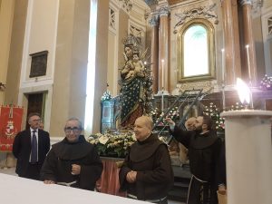 civili e militari, la statua della Patrona di Benevento è stata portata in processione, dopo la solenne concelebrazione presieduta dal Ministro provinciale dei Frati minori, Padre Antonio Tremigliozzi che ha esultato affermando: “Grazie per questa vostra presenza e affetto a Maria,questa sera siamo una grande famiglia, un piccolo grande cenacolo. Un evento straordinario e portatore di Grazia, non c’e’ una tradizione sulle uscite della Madonna,esce quando c’e necessità della sua presenza, un evento mariano e diocesano. Viviamo una nuova Pentecoste. La vicinanza di Maria è garanzia della Pentecoste. “Viviamo”,conclude il Ministro Tremigliozzi, “il mistero della discesa.Maria oggi scende a vedere la nostra città,entra nelle nostre paure,le nostre sofferenze. Da cittadino e Ministro mi auguro che questa uscita porti il dono dell’amore”. Il corteo si è snodato lungo tutto il corso Dante fino a raggiungere la Cattedrale dove, la Madonna delle Grazie rimarrà esposta alla venerazione dei fedeli in Duomo fino alla sera di domenica 20 maggio. Qui si terrà la solenne concelebrazione, in programma alle ore 20, presieduta dall’arcivescovo Felice Accrocca e l’atto di affidamento dell’Arcidiocesi alla Madonna in processione ritornerà nel “suo” santuario. Un evento che non avveniva da diversi anni nella città e che resterà nella storia,sette anni fa l’ultima uscita dalla Basilica.