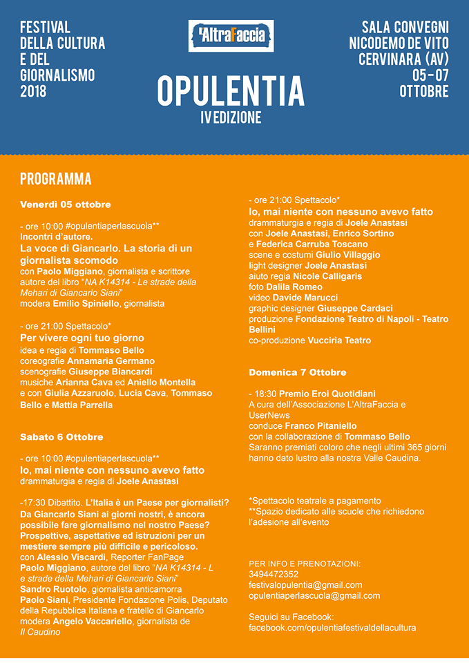 Nella prima giornata, venerdì 5 ottobre, alle ore 10.00, si dà inizio alla kermesse con la sezione Incontri d’autore nell’ambito di #opulentiaperlascuola: “La voce di Giancarlo. La storia di un giornalista scomodo.” con Paolo Miggiano, giornalista e autore del libro NA K14314 – Le strade della Mehari di Giancarlo Siani, che dialoga con il giornalista Emilio Spiniello. A seguire, alle ore 21.00, lo spettacolo Per vivere ogni tuo giorno, idea e regia di Tommaso Bello, coreografie Annamaria Germano, scenografie Giuseppe Biancardi, musiche Arianna Cava, Aniello Montella, con Giulia Azzaruolo, Lucia Cava, Mattia Parrella e Tommaso Bello. Nella seconda giornata, sabato 6 Ottobre, per l’ambito #opulentiaperlascuola, alle ore 10.00, è messo in scena lo spettacolo Io, mai niente con nessuno avevo fatto drammaturgia e regia di Joele Anastasi con Joele Anastasi, Enrico Sortino e Federica Carruba Toscano.