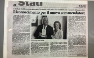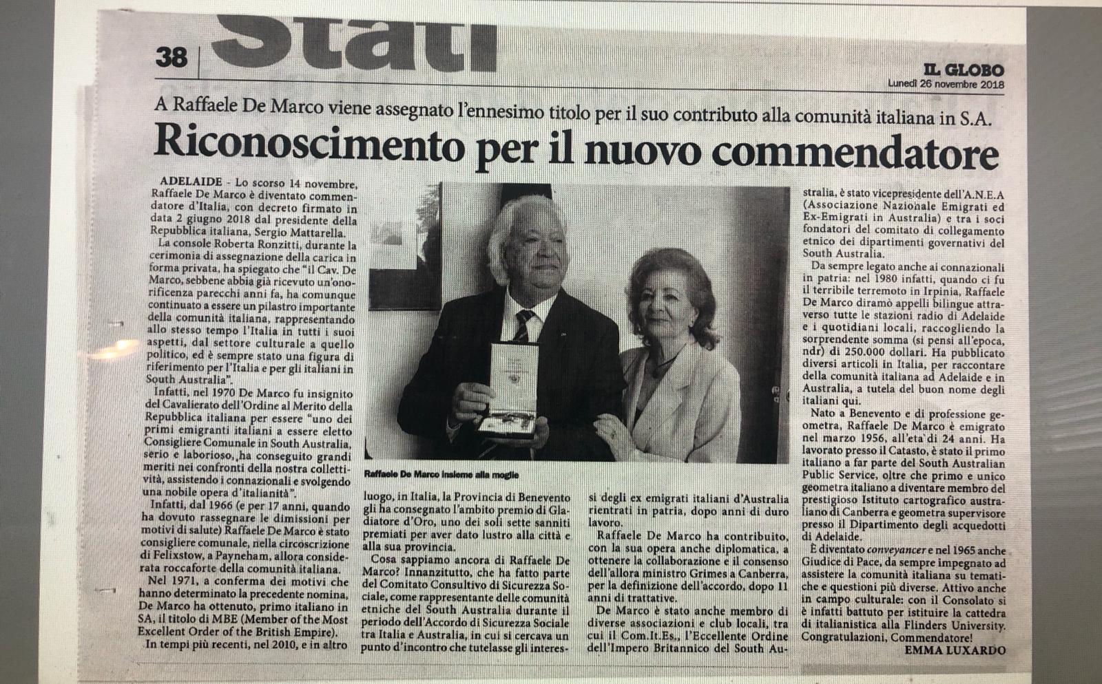 Il “beneventano d’Australia”, Raffaele De Marco, è stato insignito di recente, con l’autorevolissimo titolo di Commendatore della Repubblica dell’Ordine Stella d’Italia, per volere dello stesso Presidente Sergio Mattarella, firmatario dell’apposito Decreto in data 2 Giugno 2018.