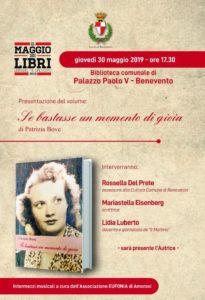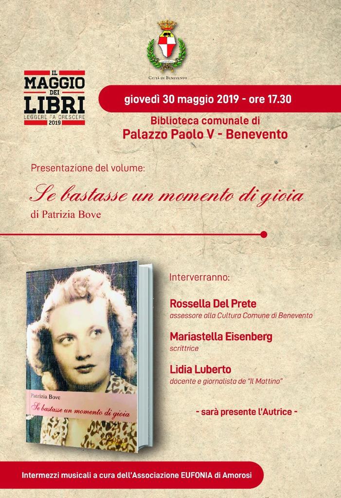 Domani giovedì 30 maggio alle ore 17.00, sarà presentato il libro ” Se bastasse un momento di gioia” di Patrizia Bove. L’evento culturale si terrà presso la Biblioteca comunale di Palazzo Paolo V, nell’ambito de’ il maggio dei libri 2019. Interverranno oltre all’autrice del libro, Rossella Del Prete,Assessore alla Cultura del Comune di Benevento,Mariastella Eisenberg,scrittrice, Lidia Luberto,docente e giornalista de “Il Mattino”.