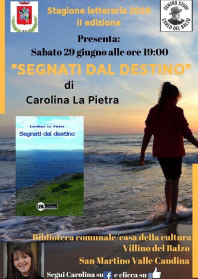 Si intotola “Segnati dal destino”il romanzo di Carolina La Pietra, giovane scrittrice di San Martino Valle Caudina.Il libro sarà presentato al pubblico sabato 29 giugno alle ore 19.00, presso il Villino del Balzo (Biblioteca comunale -Casa della Cultura) a San Martino Valle Caudina.