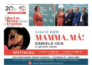Aprirà la rassegna, il 23 novembre 2019, il monologo curato e scritto da Massimo Andrei “Mamma, Mà!” interpretato dall’attrice partenopea Daniela Ioia, reduce, tra le altre cose, dall’esperienza della quarta stagione di Gomorra. La piece, dal tratto divertente e dinamico, vede protagonista una donna alle prese con un test di gravidanza e con i vari interrogativi sulla futura maternità. Le potenziali risposte arriveranno in sogno. L’interpretazione di “Mamma, Mà!”, che prova a descrivere il mondo femminile e il desiderio di maternità, ha reso a Ioia la premiazione al Comic Off. Il cartellone prevede per l’11 gennaio 2020 lo spettacolo dal titolo “Giuseppina, una donna del Sud” di e con Pierluigi Tortora, eclettico uomo del teatro nei ruoli di attore, regista e produttore, che ha prestato la sua arte anche al cinema lavorando, tra gli altri, con Paolo Sorrentino nell’”Uomo in più”. Seguirà il 15 febbraio 2020 lo spettacolo “Odissea nella Musica” con il trio Pianophonium composto da Maurizio Baratta, Franco Falzarano e Francesco Moccia. Il 21 marzo 2020 andrà in scena “Il Cane di fuoco” di e con il cuntatore Massimo Andrei accompagnato dalla musica di Eduarda Iscaro e Vincenzo De Lucia. Chiuderà, sabato 18 aprile 2020, il reading musicale liberamente tratto dai testi poetici di Emilio Piccolo “Ok, la rivoluzione non ci sarà” di e con Angelo Maiello, accompagnato dalla chitarra del M° Roberto Melisi.